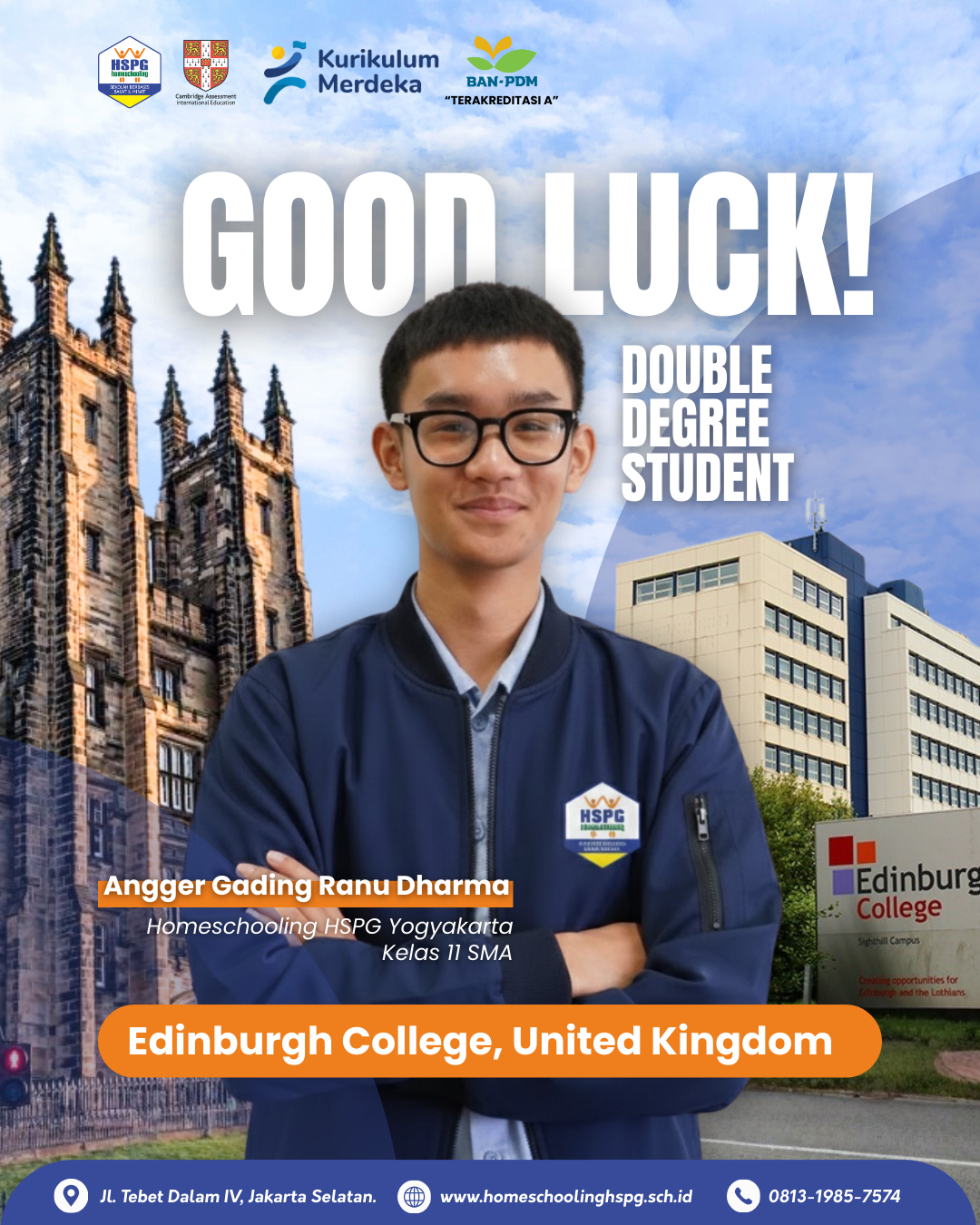 Sebuah kabar membanggakan datang dari keluarga besar Homeschooling HSPG. Salah satu peserta didik kelas XI SMA, Angger Gading Ranu Dharma, mendapatkan kesempatan istimewa untuk mengikuti International Course February–July 2026 di Edinburgh College, United Kingdom.
